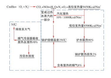在傳統(tǒng)鍋爐中,燃料在鍋爐燃燒后,排煙溫度相對較高,煙氣中的水蒸汽仍處于氣態(tài),會帶走大量的熱量。在各類化石燃料中,天然氣的氫含量最高,氫的質量百分數(shù)約為20%~25%,因此,排煙中含有大量的水蒸汽,據(jù)測算,燃燒1m3天然氣產(chǎn)生的水蒸汽要帶走的熱量約為4000KJ,約為其高位發(fā)熱量的10%以上。